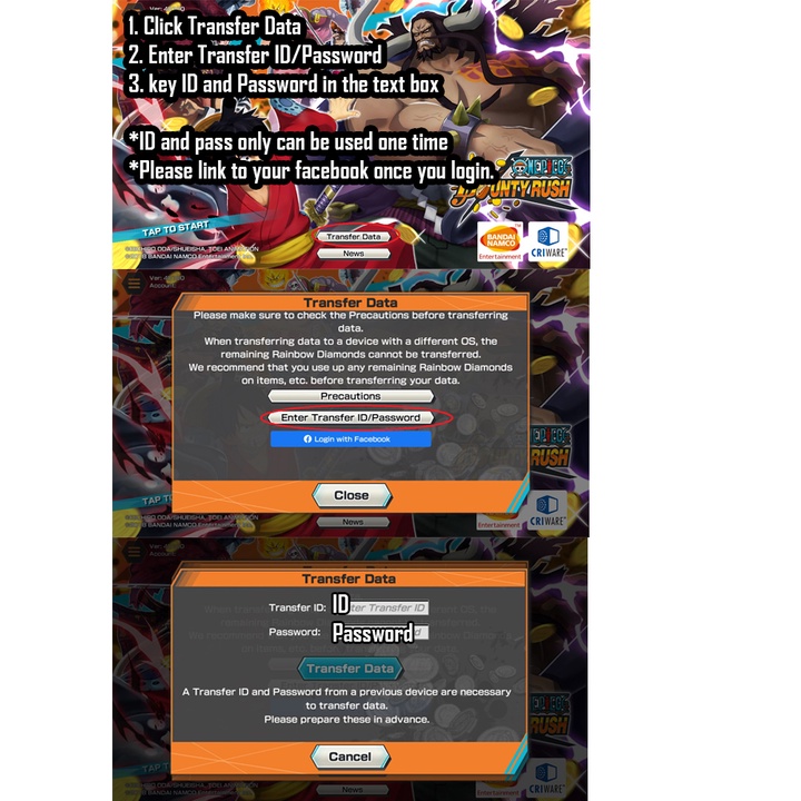 Product DetailsOne Piece Bounty Rush Starter Account Diamonds Global ServerPlease make sure your connection is stable before you redeemFor IOS OnlyID and pass only can be used. Then you need to click on the button at the bottom.